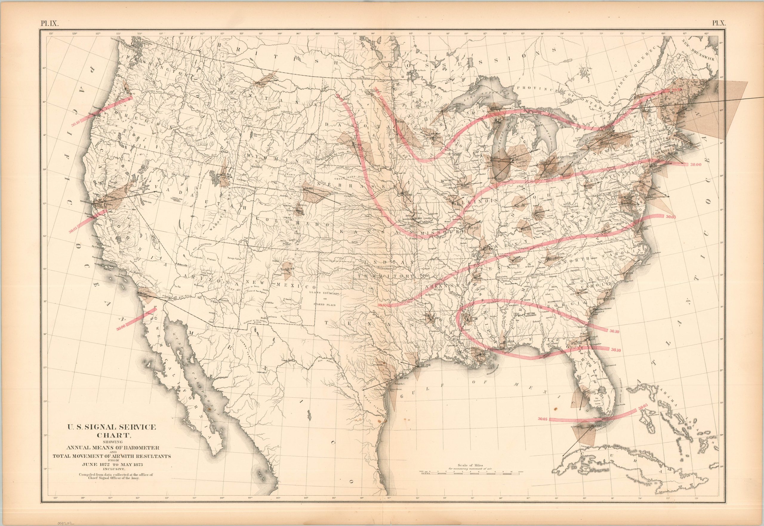 U.S. Signal Service Chart Showing Annual Means of Barometer and Total Movement of Air with Resultants from June 1872 to May 1873